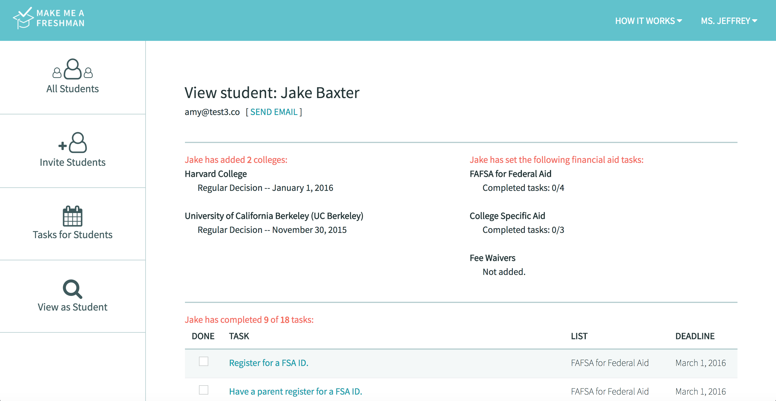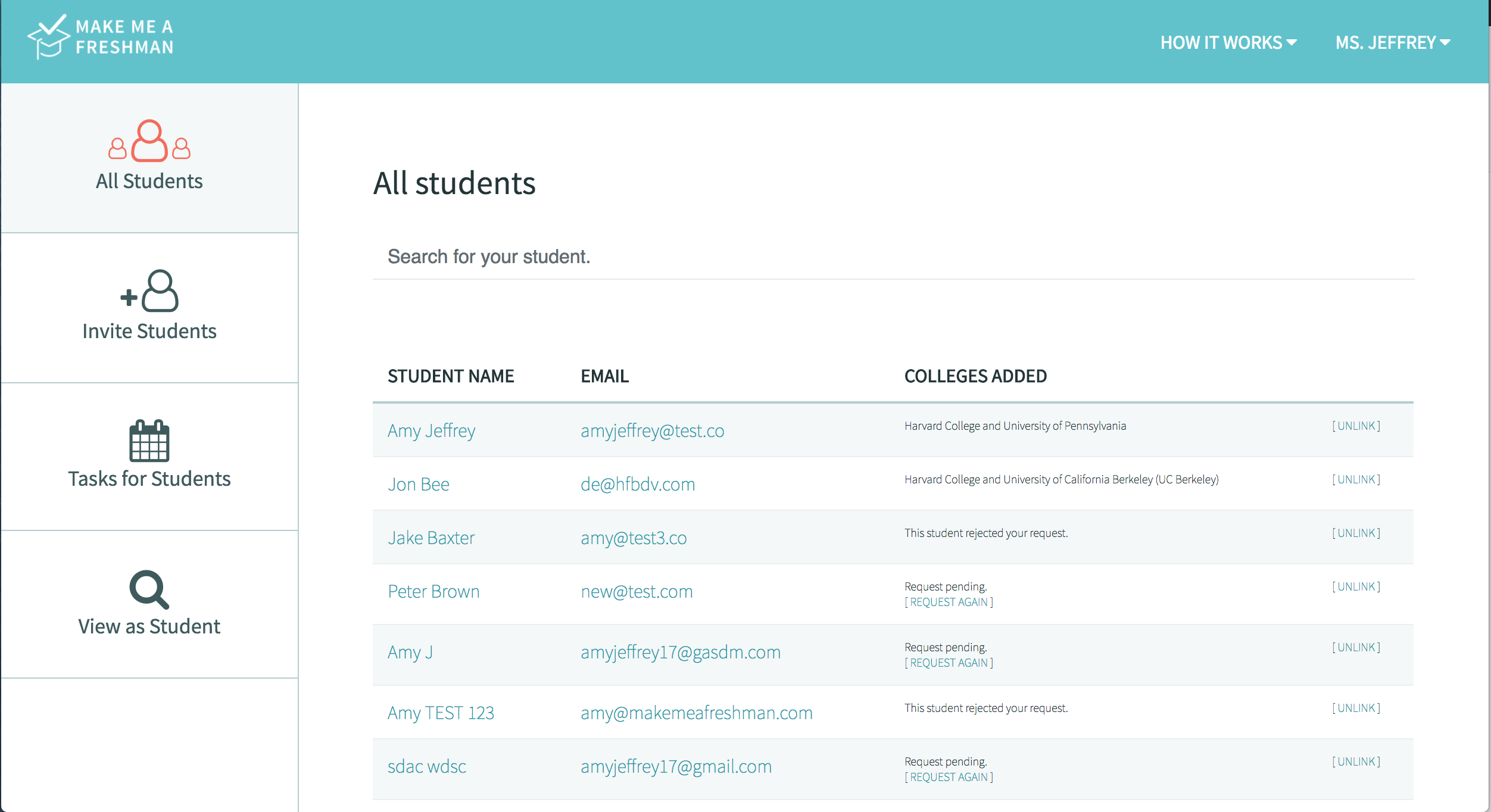 All of these email addresses will receive an email explaining what Make Me a Freshman is and inviting the user to register and share his or her progress with you. Before the students register, you will see a list of these email address. Once a student registers and accepts your request, you will see his or her name. Also, clicking on the student's email will take you to your email provider to send an email to that student. You can also email all students.