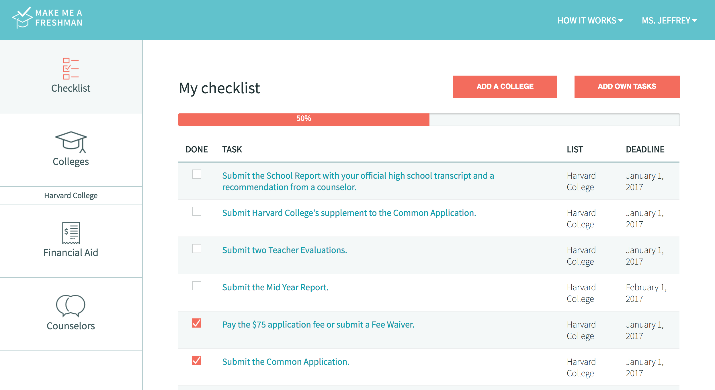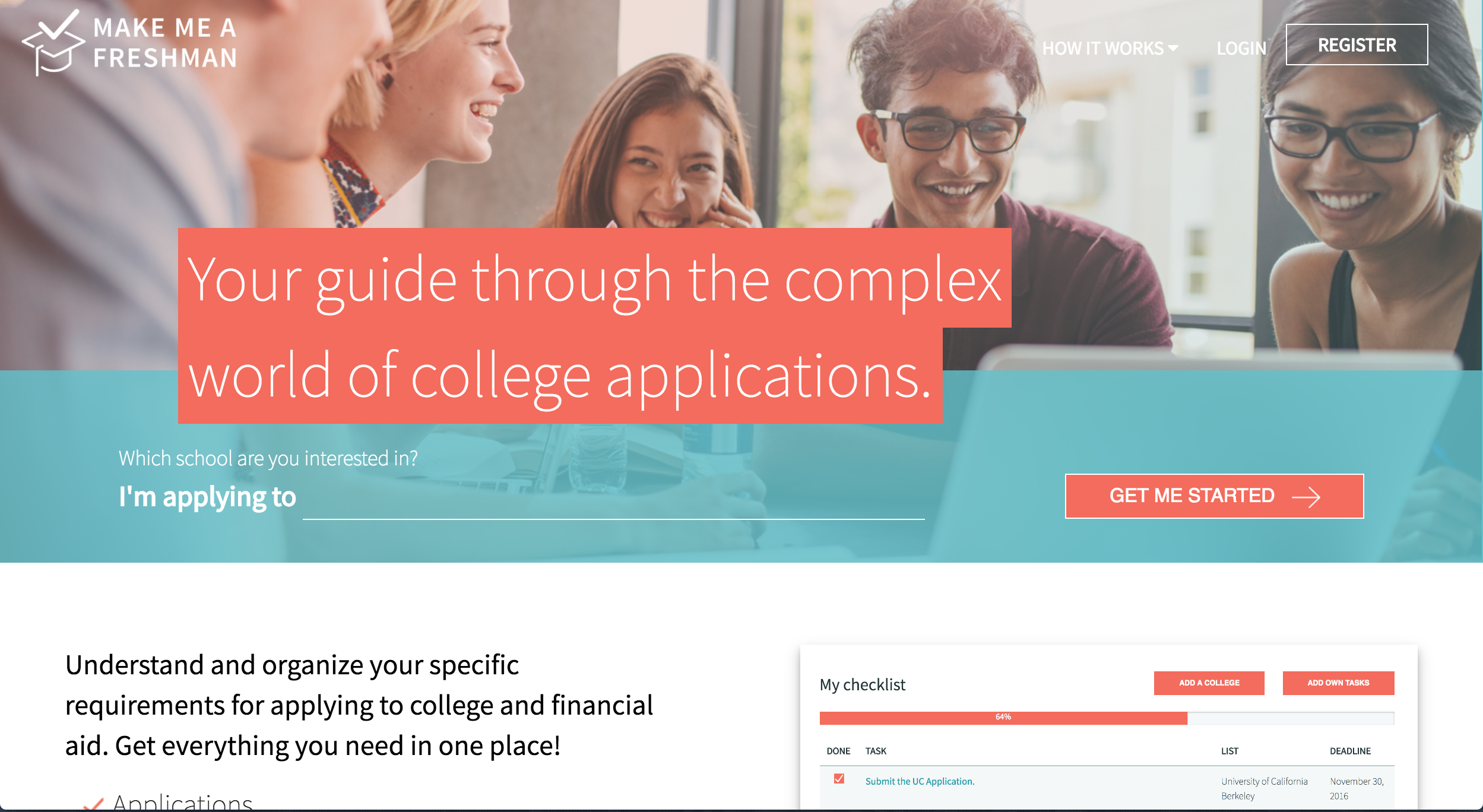 Make Me a Freshman is a free website that helps you understand and organize your college application and financial aid requirements. Simply choose your colleges and set your preferences to generate a checklist with all your specific requirements and deadlines, with tips and reminders along the way!