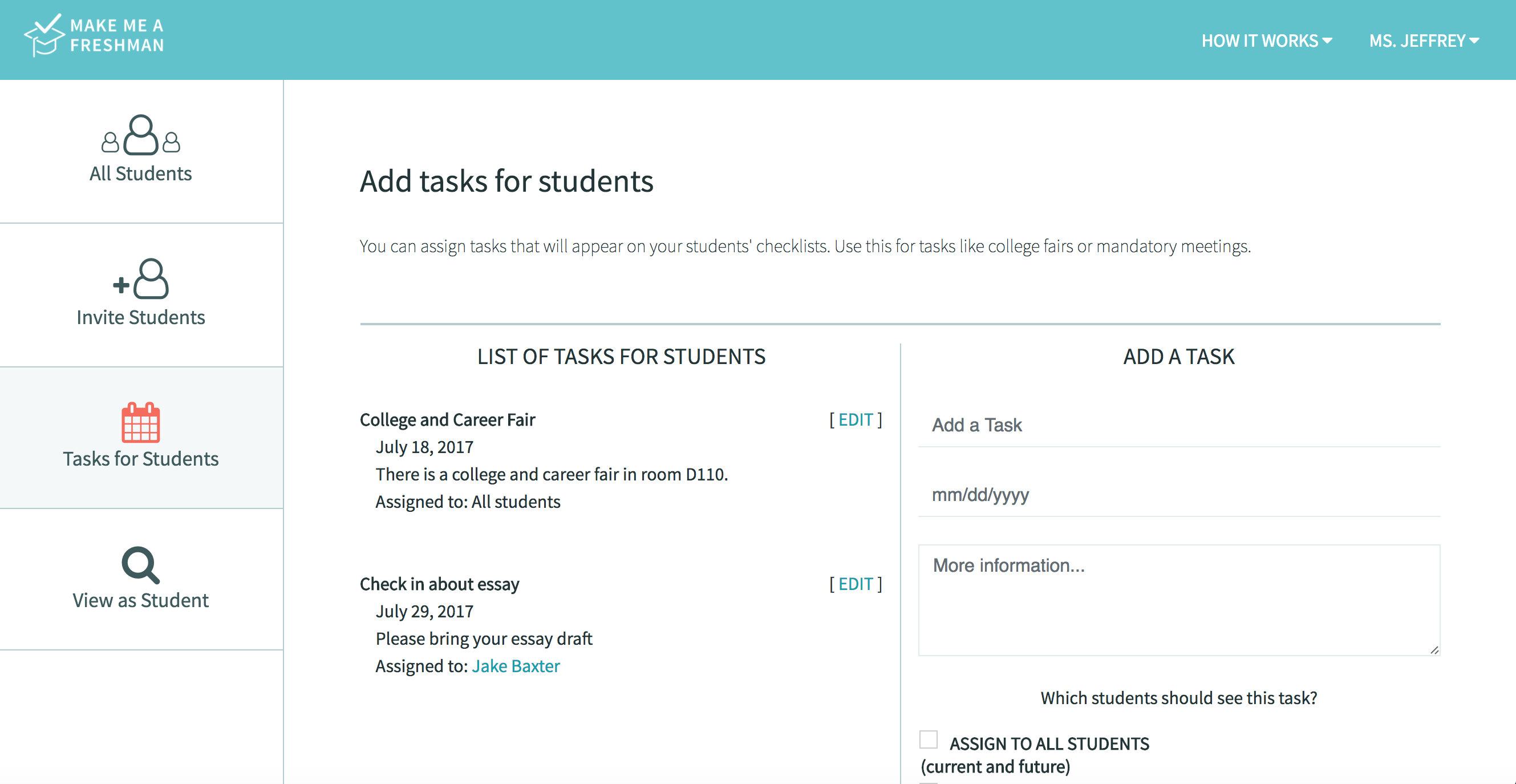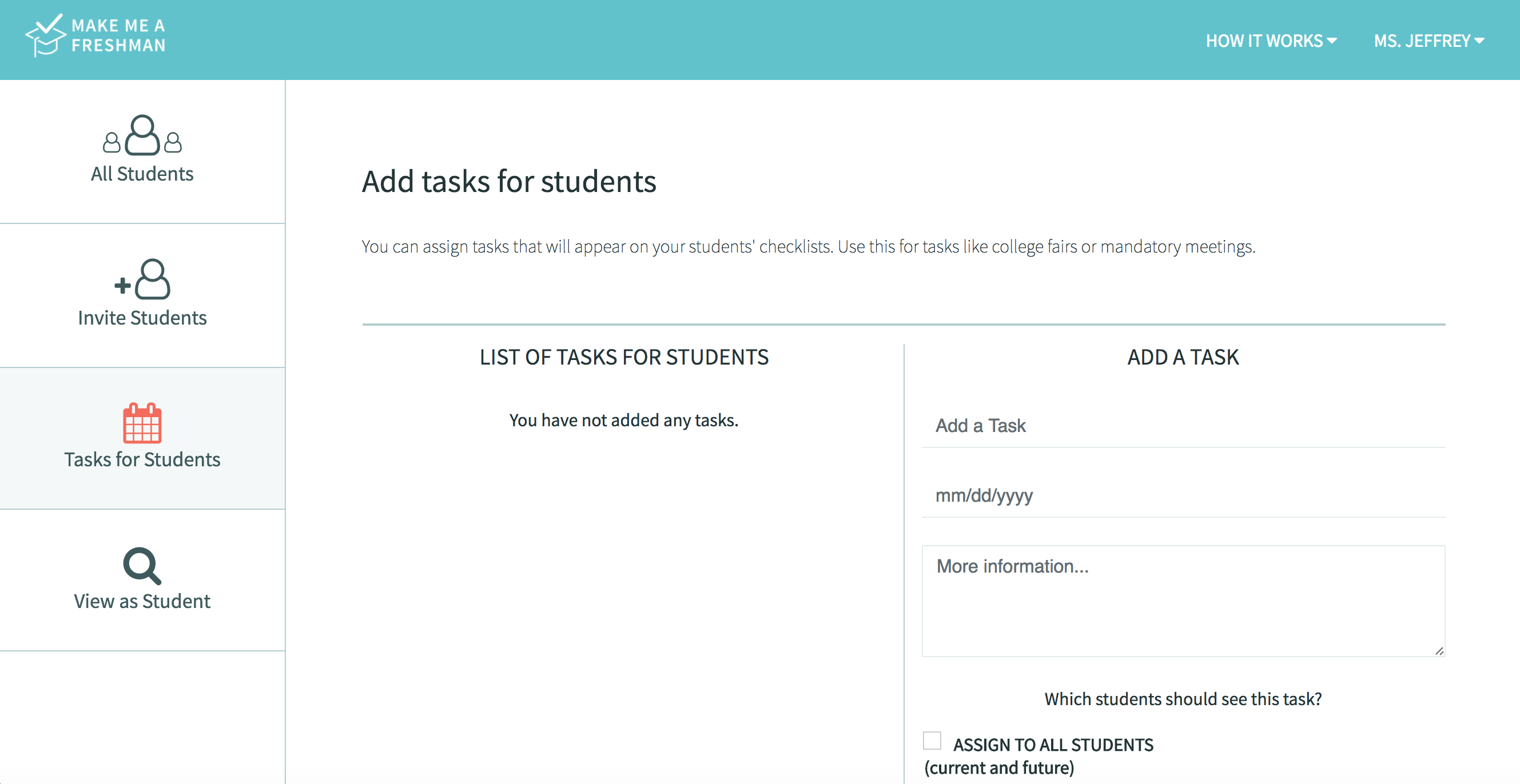 With Make Me a Freshman, you can create and assign tasks to your students. You can assign a task to an individual, a group of students, or all your students. You will see a blank form with the ability to add a task name with optional details about that tasks and an optional deadline.
