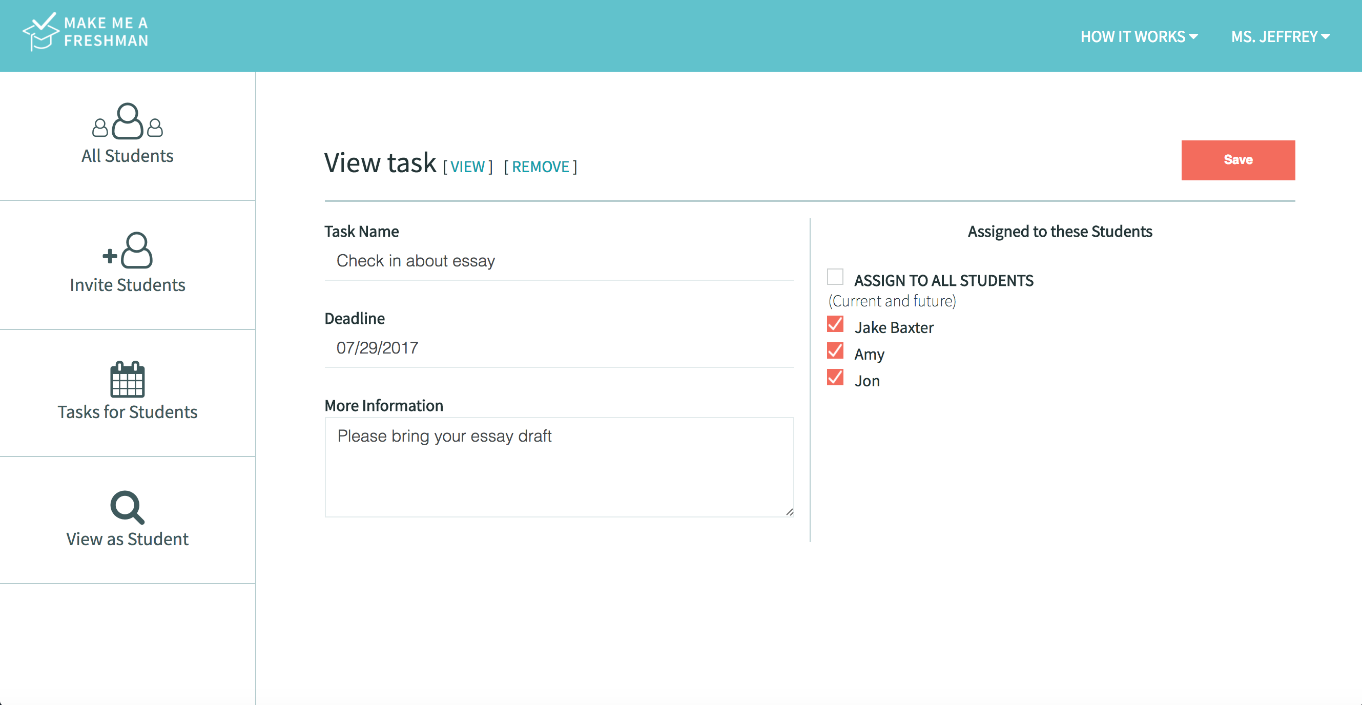 With Make Me a Freshman, you can create and assign tasks to your students. You can assign a task to an individual, a group of students, or all your students. You will see a blank form with the ability to add a task name with optional details about that tasks and an optional deadline.