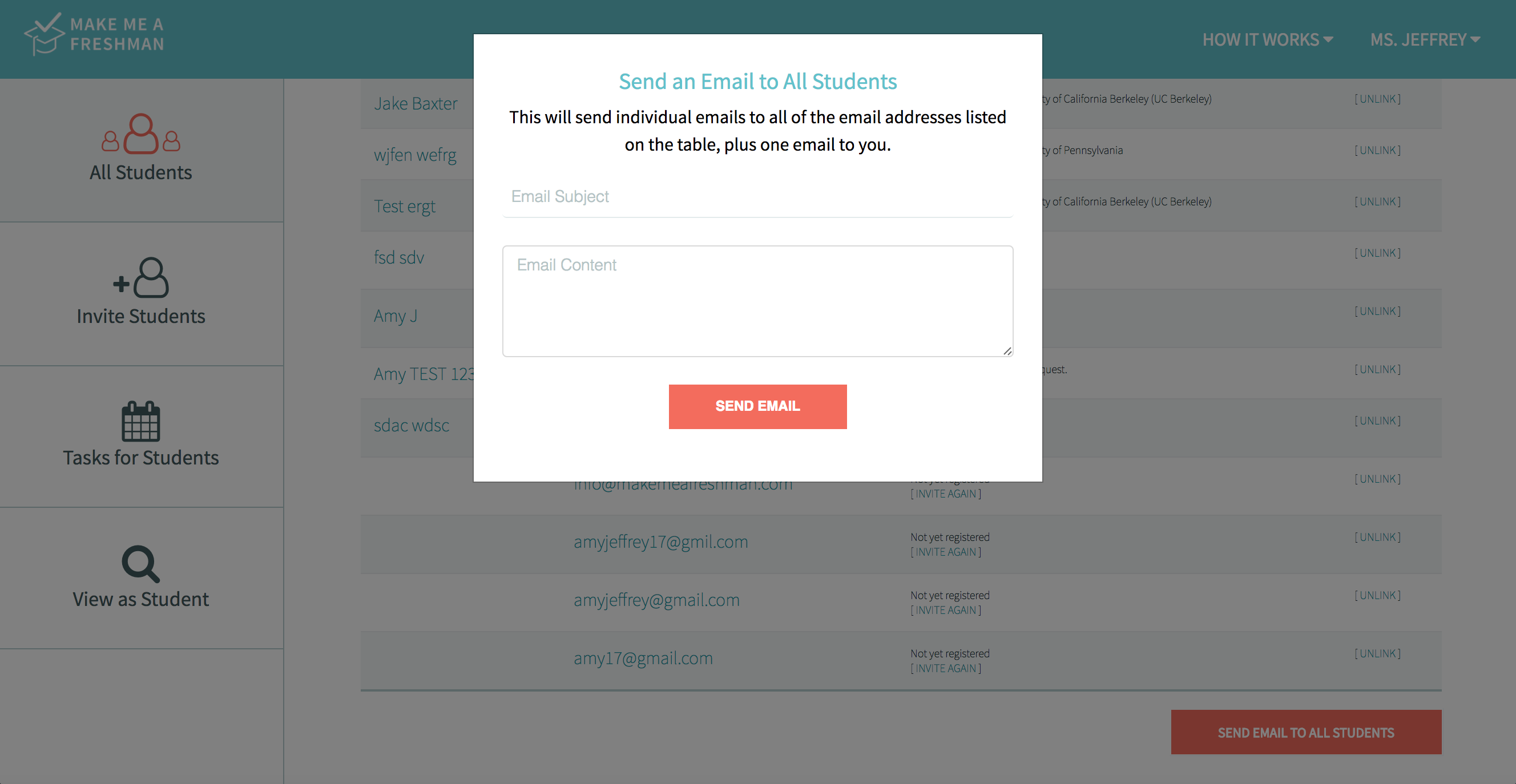 All of these email addresses will receive an email explaining what Make Me a Freshman is and inviting the user to register and share his or her progress with you. Before the students register, you will see a list of these email address. Once a student registers and accepts your request, you will see his or her name. Also, clicking on the student's email will take you to your email provider to send an email to that student. You can also email all students.
