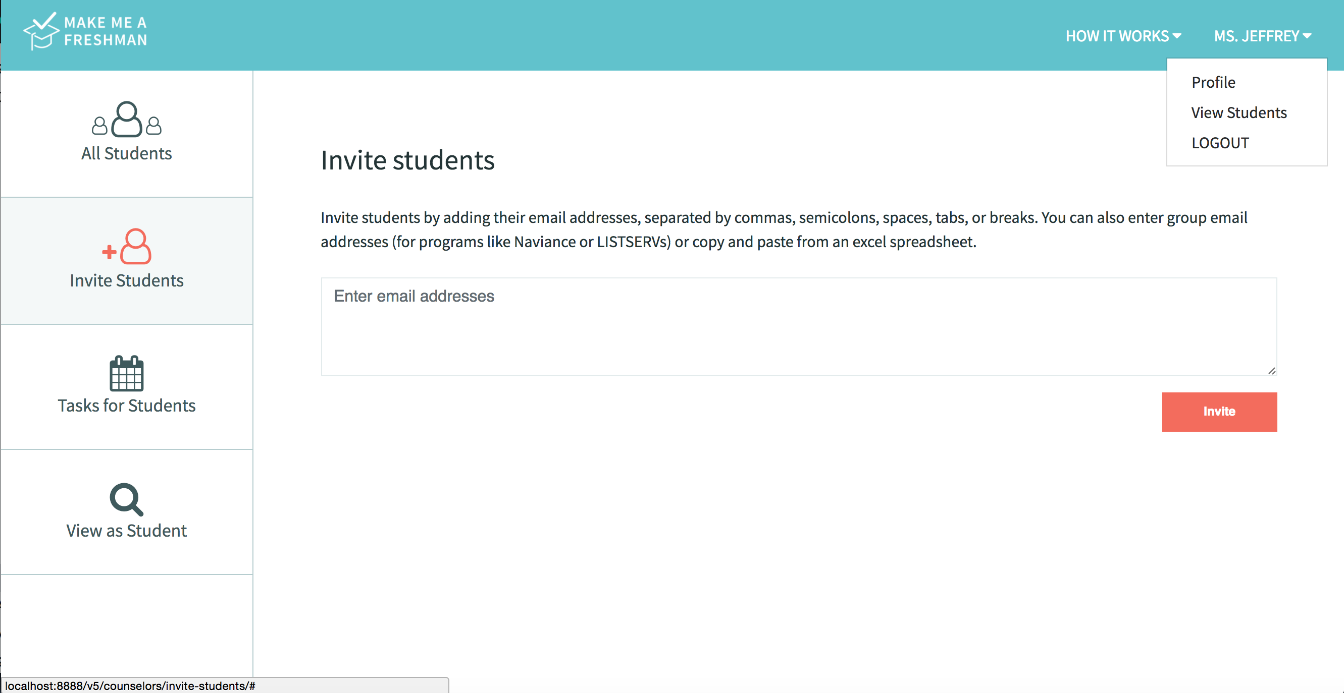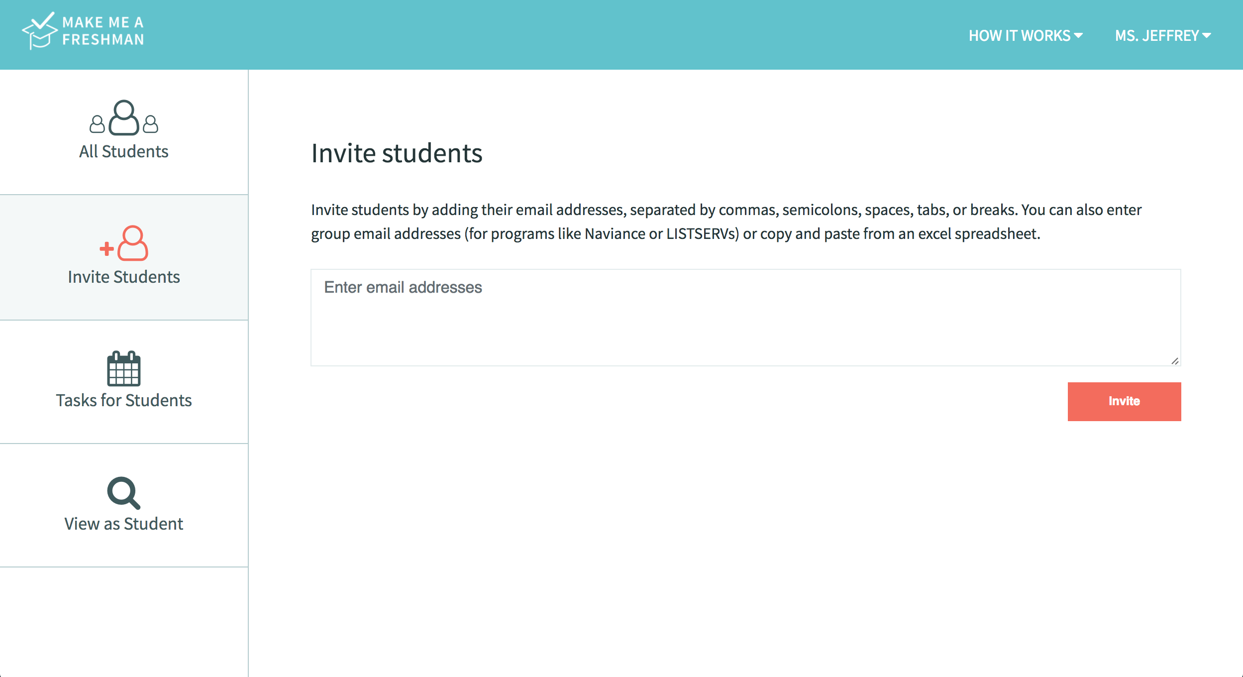 Inviting students to use Make Me a Freshman is easy. When you first register, you will see a box for adding student email addresses. You can type one address or copy and paste a large number of email address from an Excel spreadsheet.