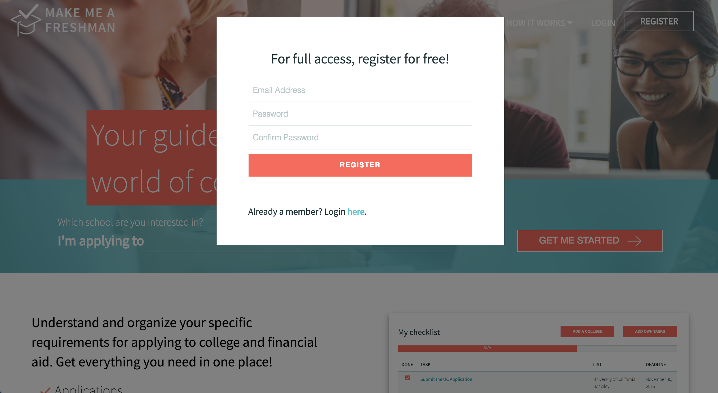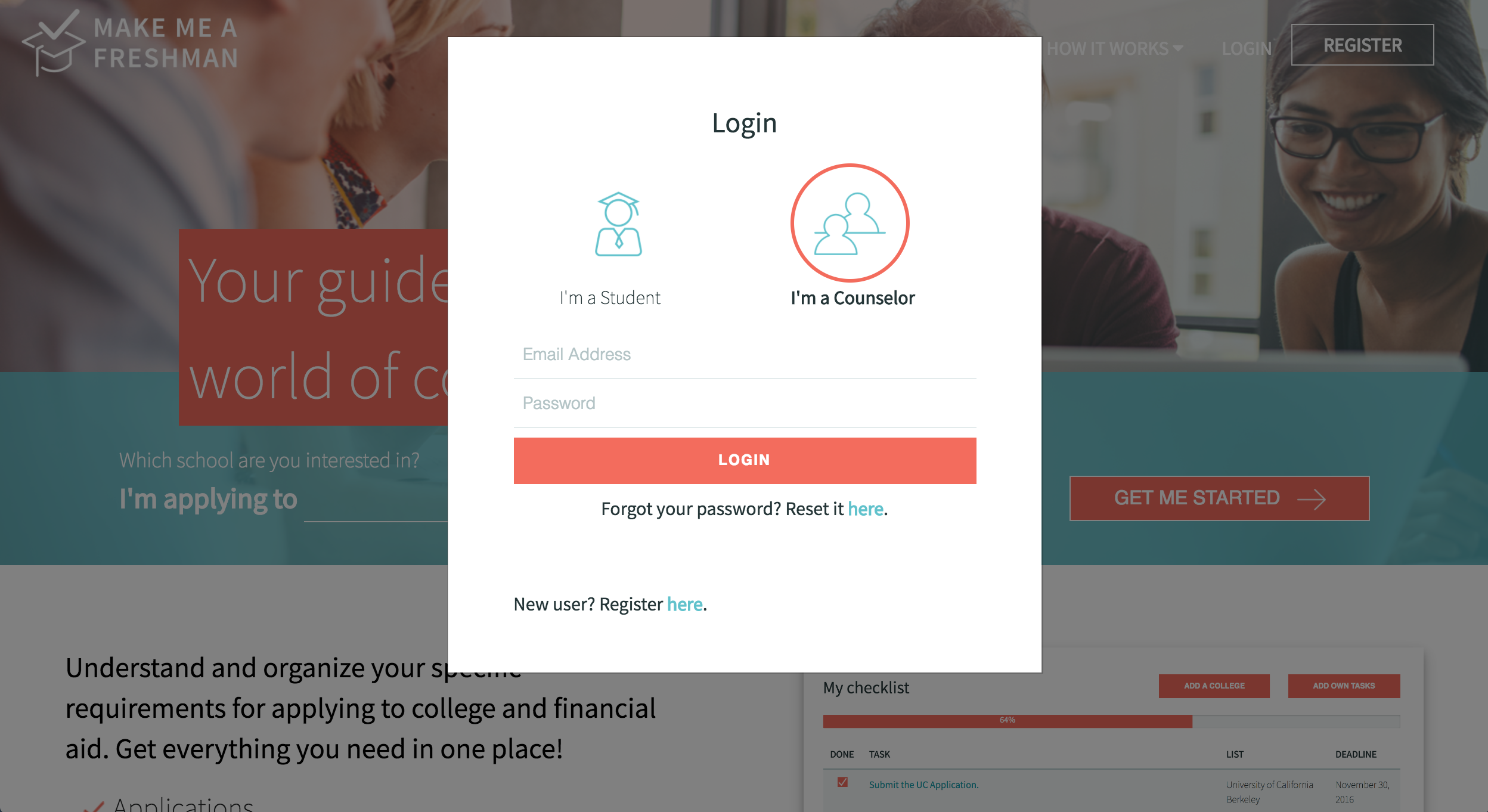 You can register as a student or counselor, but this guide will show you exactly how to use MakeMeAFreshman.com as a counselor. In this case, counselors can be high school counselors, independent college advisors, mentors at non-profits, teachers, parents, etc.